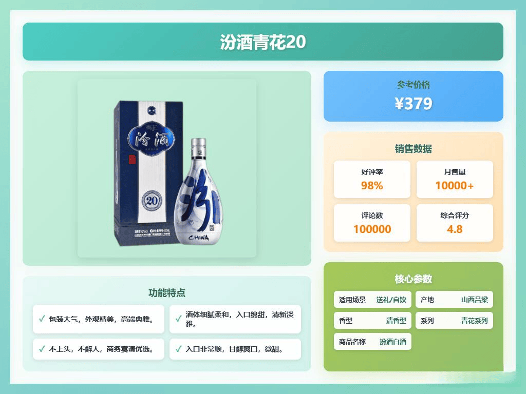包装设计简洁大方,礼盒装更添尊贵感,是送礼和自饮的不错选择。整体来说,青花20在保持传统韵味的同时,满足了现代花了钱的人品质和品味的追求。喜欢清香型白酒的朋友可优先考虑入手,享受一份纯粹的酒香体验。