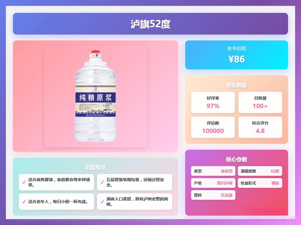 这款白酒很适合商务宴请、纪念日或朋友聚会,能提升整体档次。品牌采用严格的酿造工艺,确保每一瓶酒都达到稳定的品质。无论是宴请贵宾还是作为珍藏,都能体现出您的用心与品味。